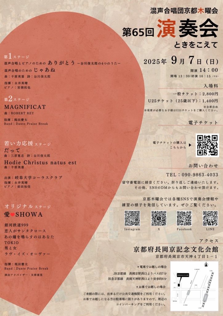 京大合唱団の春発が開催されます。 久々に男声・女声・混声 各ステージでの演奏会です。 日時 2025年4月26日 開場14時 開演14時半 入場無料 会場 京…