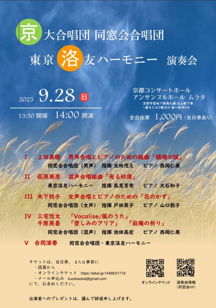 京都で活動している京大合唱団同窓会合唱団(長・・・)と東京で活動している東京洛友ハーモニーの演奏会が開催されます。日時 2025年9月28日(日) 13時3…